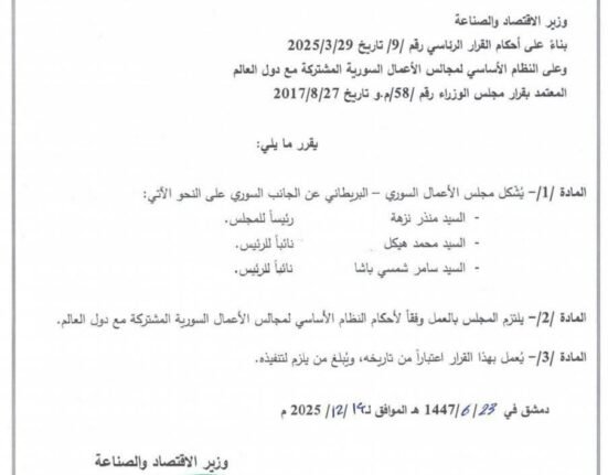 وزارة الاقتصاد والصناعة تصدر قراراً بتشكيل مجلس الأعمال السوري- البريطاني. بهدف تعزيز العلاقات الاقتصادية وتشجيع الفرص الاستثمارية.